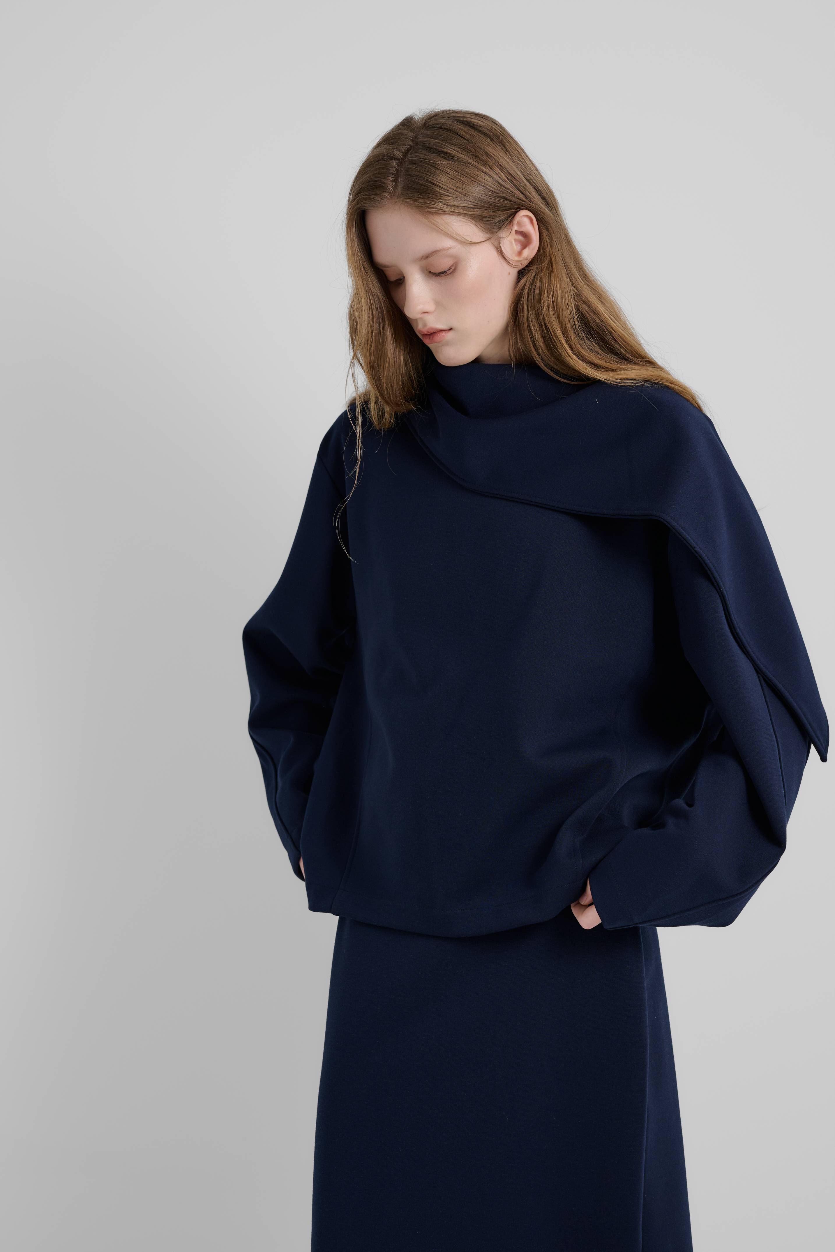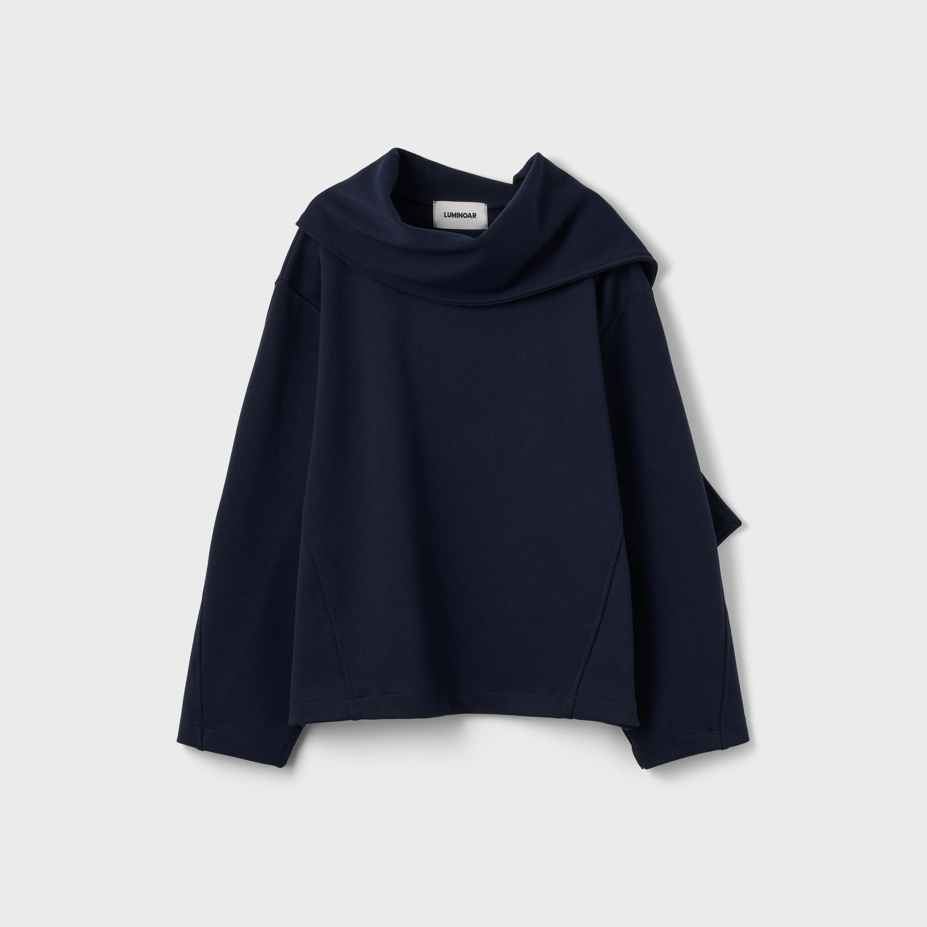 단순한 티셔츠를 넘어 룩 전체의 분위기를 결정짓는 감도 높은 디자인의 오프숄더 분또 탑입니다. 탄탄하면서도 유연한 텐션감이 느껴지는 최고급 분또 원단을 사용하여, 몸에 붙지 않고 입체적인 실루엣을 유지해주어 체형 보정 효과가 탁월합니다.이 제품의 가장 큰 특징은 어깨 라인을 타고 흐르는 유려한 드레이프 넥 라인입니다. 넓게 펼쳐진 카라 형태의 넥 디자인은 목선을 길어 보이게 할 뿐만 아니라, 여유 있는 루즈핏으로 제작되어 활동성이 뛰어나며, 소매와 몸판의 절개 디테일이 더해져 자칫 밋밋할 수 있는 기본 스타일에 고급스러운 변주를 주었습니다. 롱스커트와 팬츠 세트로 착용했을 때 일체감 있는 실루엣을 완성하며, 슬랙스나 데님과 매치해도 이지적인 데일리룩을 연출할 수 있습니다. 칙칙하지않은 NAVY톤이 안색을 밝혀주어 격식 있는 자리는 물론, 일상의 특별한 순간까지 두루 활용하기 좋은 루미노어의 시그니처 아이템입니다.