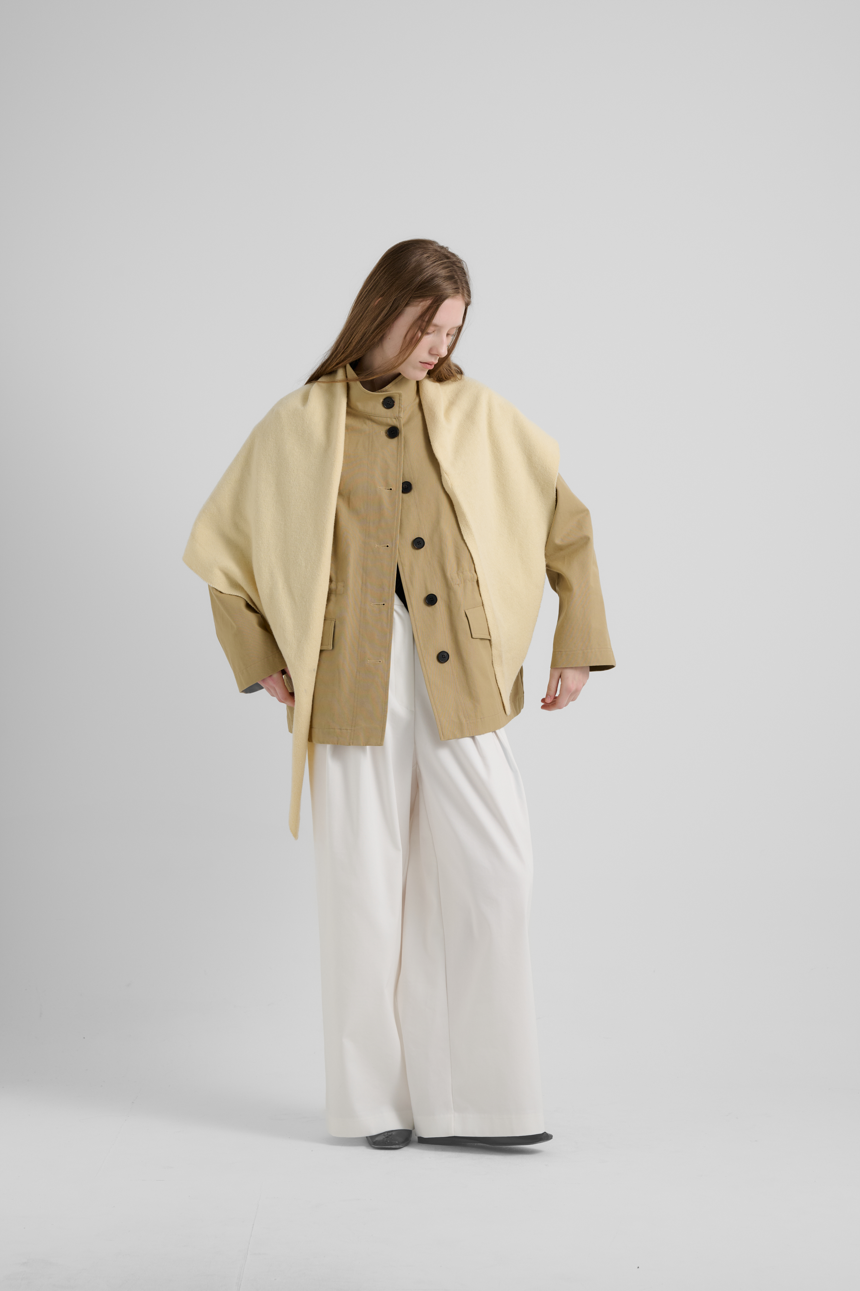 울 블렌드 니트로 제작된 케이프 아이템으로, 부드럽고 따뜻한 착용감을 선사합니다. 자연스러운 드레이프 실루엣이 특징이며, 어깨에 걸치거나 목선을 감싸듯 연출할 수 있어 다양한 스타일링이 가능합니다 .옆선에 단추와 단추 구멍 2개가 있어 사이즈 조절로 다양한 연출이 가능하며 심플한 룩에 포인트를 주면서도 고급스러운 무드를 살려주는 아이템입니다.양모 50%, 나일론 35%, 폴리에스터 15% 혼용으로 따뜻하고 내구성이 뛰어나며 팬츠,스커트 모두에 잘 어울리며 세트연출 가능한 가디건 부터 아우터 이너까지 레이어드 연출해서 새로운 느낌을 표현 할수 있습니다.