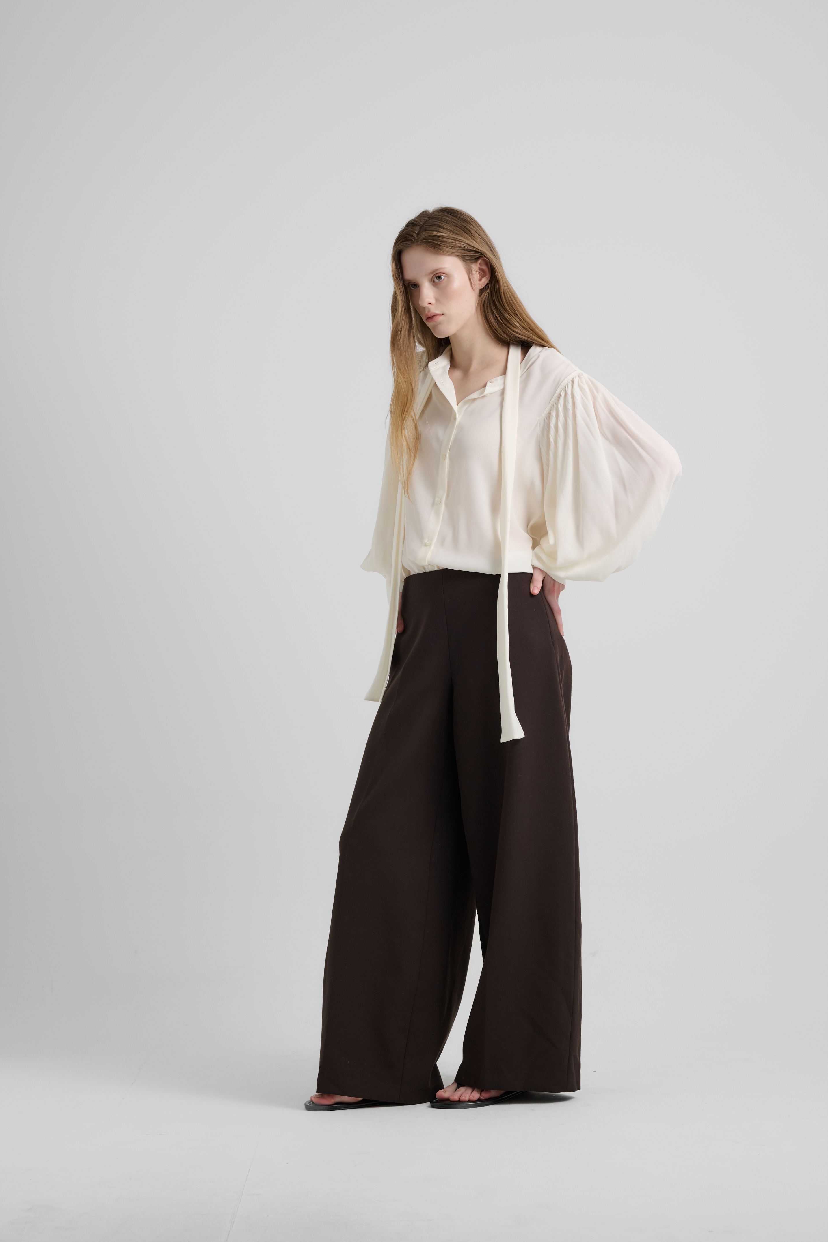 출시된 제품은 실제 모델이 착용한 블라우스 머플러 길이에서 15CM 짧게 제작 되었습니다.