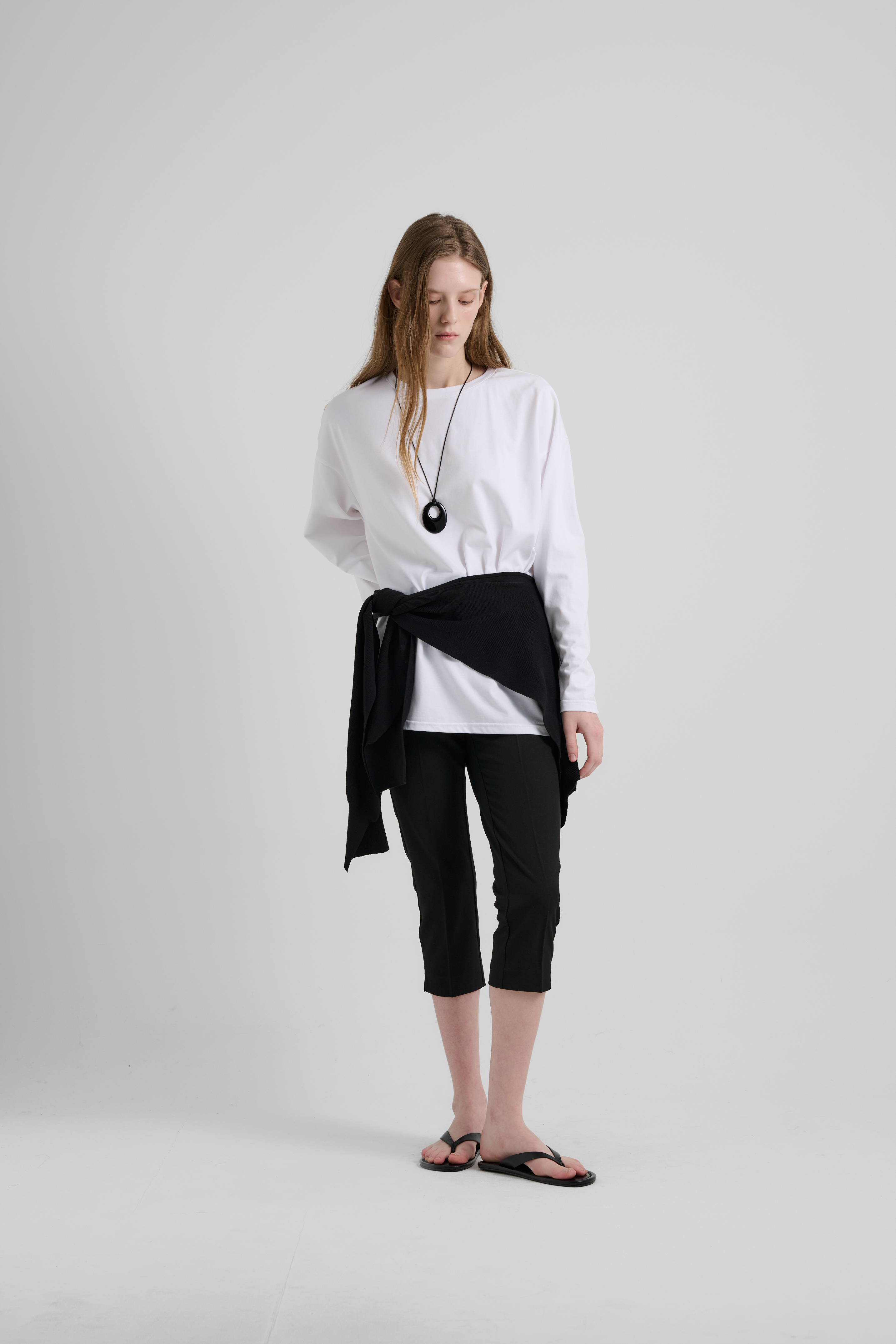 전체적으로 여유 있게 떨어지는 핏과 깔끔한 넥 라인은 단독으로는 미니멀한 분위기를, 자켓이나 니트, 아우터와 함께 매치했을 때는 이너로서 안정적인 역할을 해줍니다. 특히 소매와 기장의 비율이 과하지 않게 설계되어 레이어드 시에도 부해 보이지 않고, 자연스럽게 정리된 실루엣을 완성합니다.