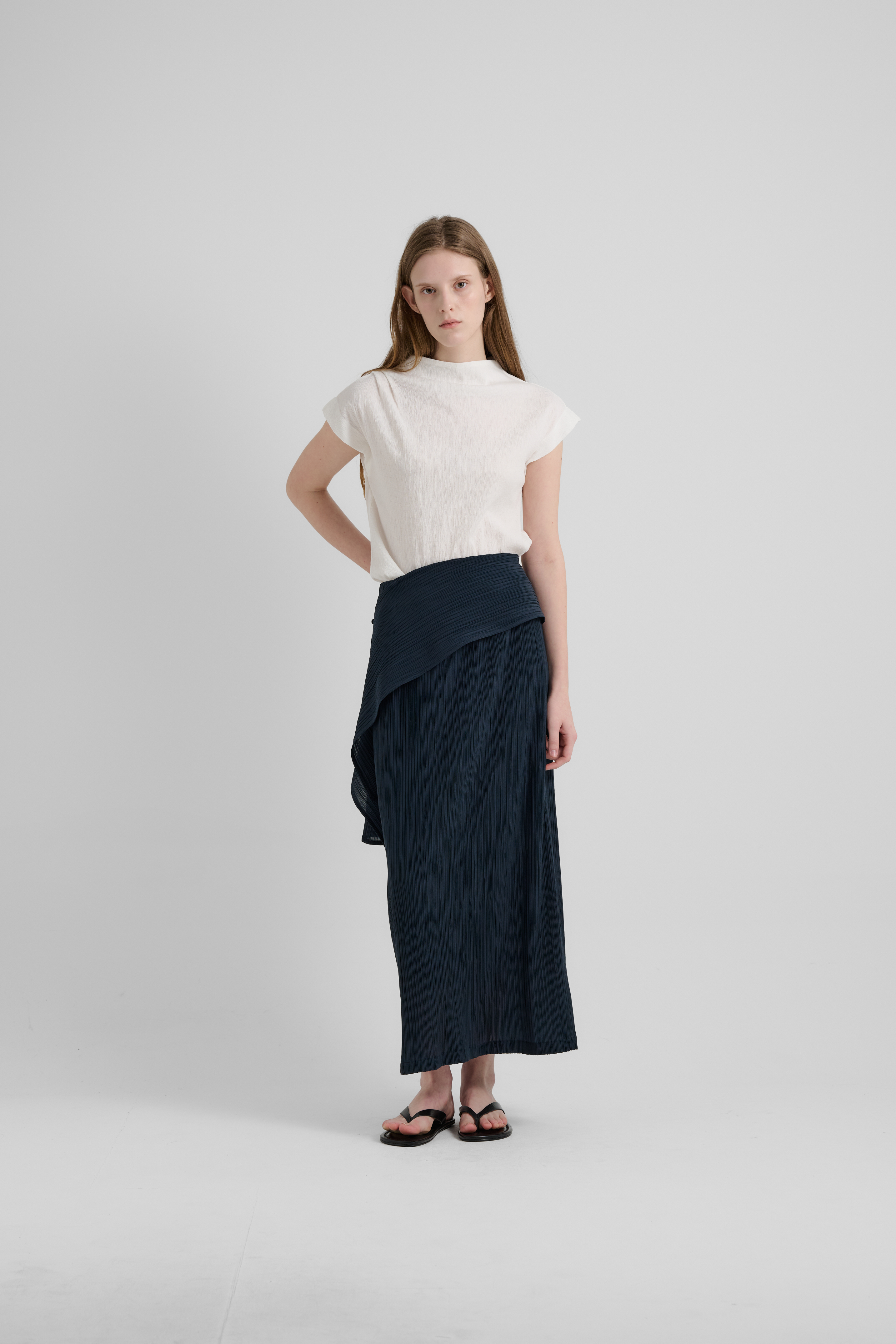 루미노어의 시그니처 플리츠를보다 구조적으로 재해석한 랩 레이어드 스커트입니다.