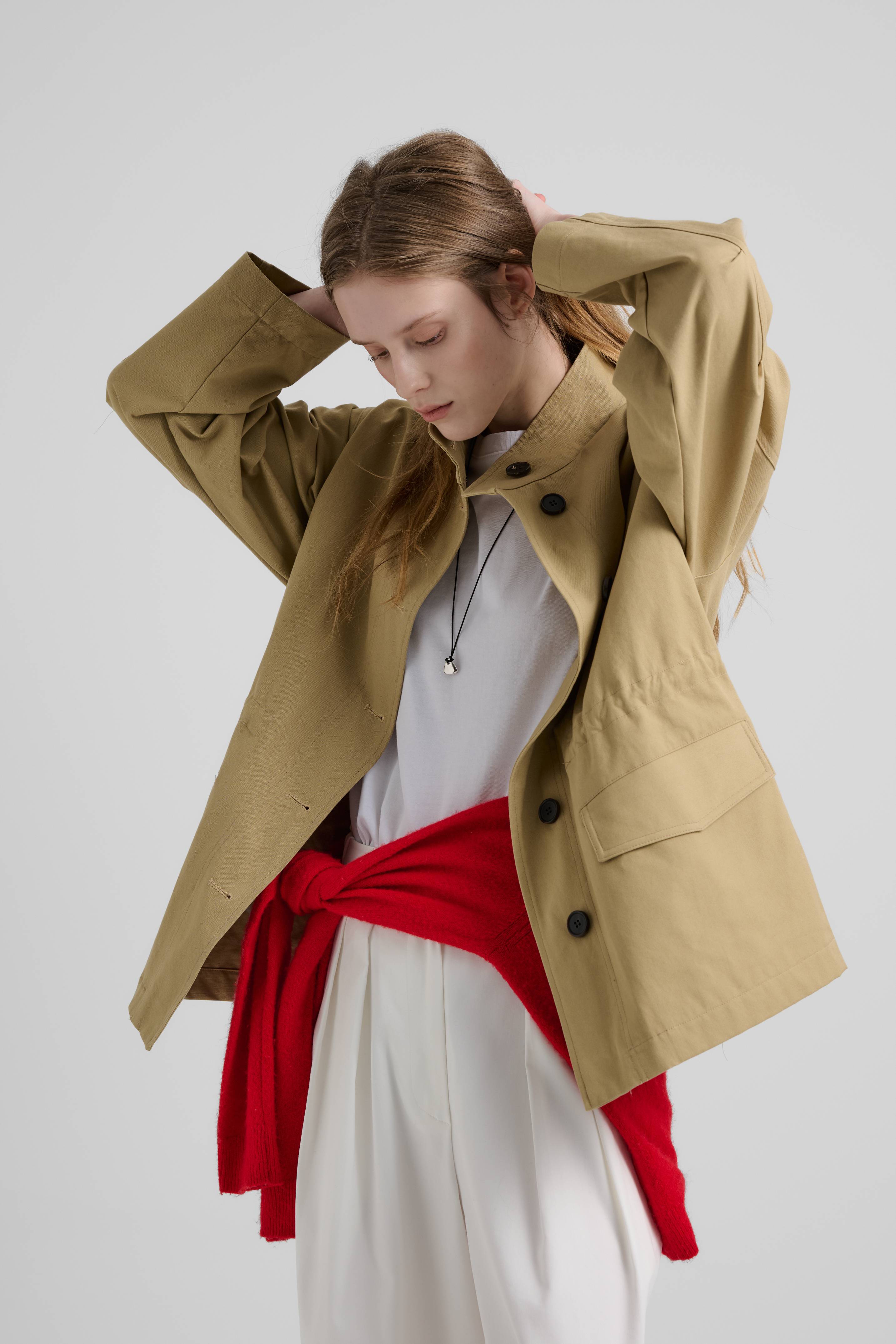 코튼 100% 소재와 홑겹 구조로 제작되어 답답함 없이 가볍고 쾌적하게 착용되며,간절기부터 초여름까지 활용도 높게 입을 수 있습니다. 힘있으면서도 유연한 텍스처가 더해져자연스럽게 떨어지는 실루엣을 만들어주며,과하지 않은 볼륨감으로 편안하면서도 세련된 무드를 연출합니다. 내부에는 허리 라인을 조절할 수 있는 스트링 디테일을 더해루즈하게 연출하거나,허리 라인을 살려 보다 여성스러운 실루엣으로도 연출이 가능합니다.카라를 생략한 미니멀한 넥 라인과입체적인 포켓 디테일이 어우러져단정하면서도 은은한 유틸리티 무드를 더해줍니다.하나의 아이템으로 다양한 핏을 연출할 수 있는,실용성과 감도를 모두 갖춘 아우터입니다.
